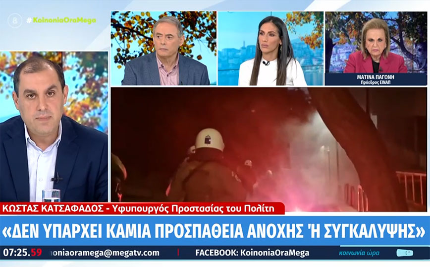 Για την επέτειο του Πολυτεχνείου, για τον θάνατου του 17χρονου στη Βοιωτία αλλά και για τις κάμερες που θα τοποθετηθούν στις στολές των αστυνομικών μίλησε την Παρασκευή (17/11) ο υφυπουργός Προστασίας του Πολίτη, Κώστας Κατσαφάδος. Όπως τόνισε σήμερα θα βρίσκονται στους δρόμους 5.000 αστυνομικοί ενώ δήλωσε πως συνδρομή θα παρέχουν από αέρος το ελικόπτερο της Αστυνομίας καθώς και drone.