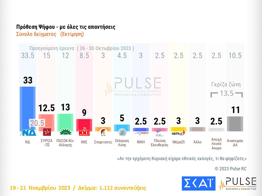 Στην πρόθεση ψήφου, η Νέα Δημοκρατία καταγράφει 33% ενώ το ΠΑΣΟΚ 13%. Ακολουθεί ο ΣΥΡΙΖΑ με 12,5% και το ΚΚΕ με 9%. Η Ελληνική Λύση καταγράφει 5% και οι Σπαρτιάτες 3%. Το 3% πιάνει και το ΜέΡΑ25 ενώ ακολουθούν Νίκη 2,5% και Πλεύση Ελευθερίας 2,5%.