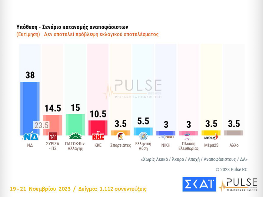 Τα αντίστοιχα ποσοστά με κατανομή των αναποφάσιστων διαμορφώνονται ως εξής: Νέα Δημοκρατία 38%, ΠΑΣΟΚ 15%, ΣΥΡΙΖΑ 14,5%, ΚΚΕ 10,5%, η Ελληνική Λύση με 5,5%, Σπαρτιάτες και ΜέΡΑ25 από 3,5% και Νίκη και Πλεύση Ελευθερίας με 3%.
