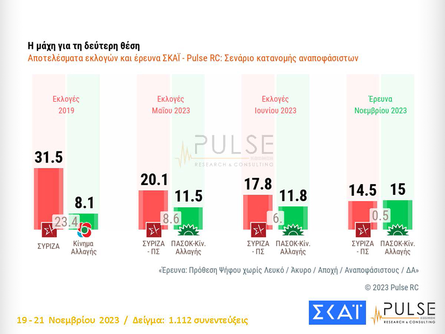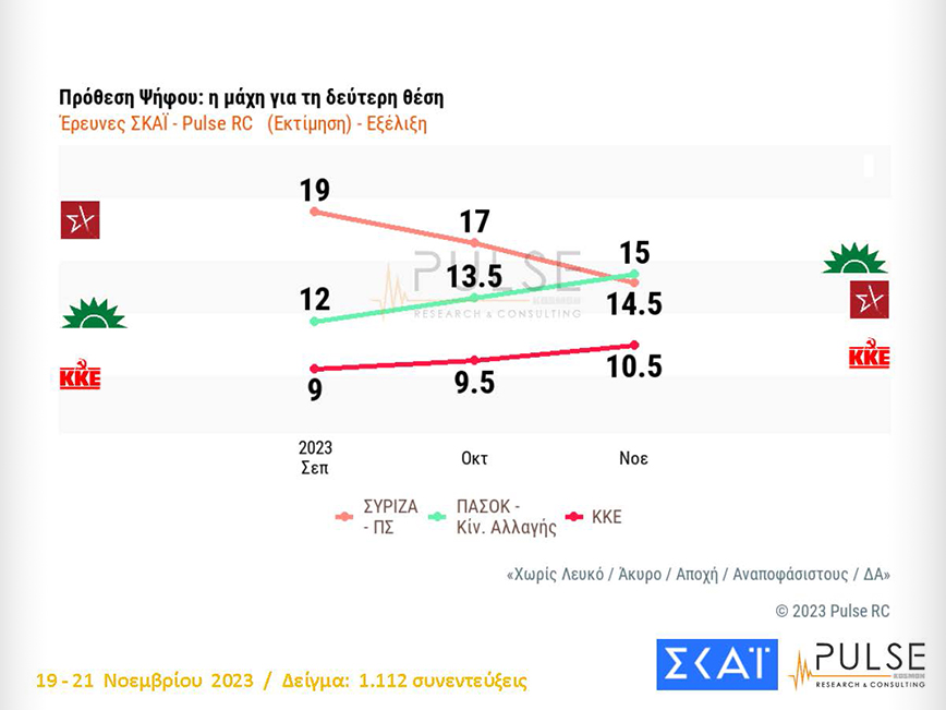 Πέμπτη συνεχόμενη δημοσκόπηση, στην οποία το ΠΑΣΟΚ υπερέχει του ΣΥΡΙΖΑ και κατακτά τη δεύτερη θέση. Στην έρευνα της Pulse για λογαριασμό του ΣΚΑΪ, το ΠΑΣΟΚ καταγράφει 13% έναντι 12,5% του ΣΥΡΙΖΑ και αυτό πριν ακόμα καταγραφεί η αποχώρηση της «Ομάδας Αχτσιόγλου».