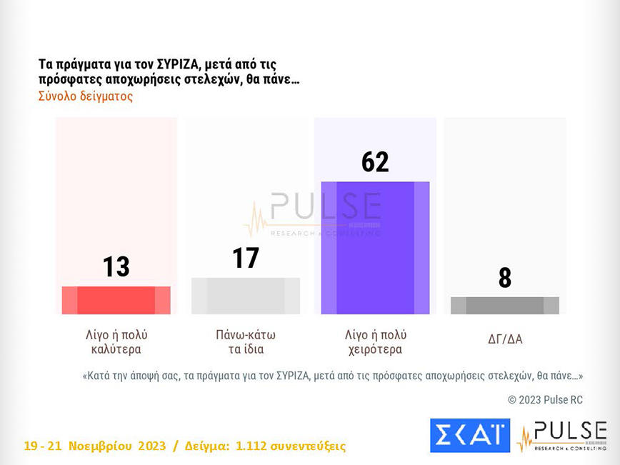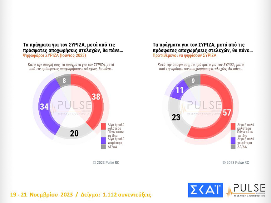 Στα του ΣΥΡΙΖΑ, ερωτώμενοι πως θα πάνε τα πράγματα μετά τις αποχωρήσεις (είχε γίνει μόνο αυτή της Ομπρέλας), το 62% απαντά «λίγο ή πολύ χειρότερα», μόλις το 17% υποστηρίζει ότι θα πάνε «λίγο ή πολύ καλύτερα».