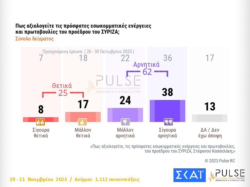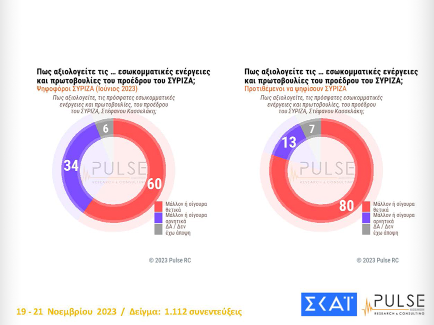 Σχετικά με τις εσωκομματικές ενέργειες του Στέφανου Κασσελάκη, αρνητικά τοποθετείται το 62% (38% σίγουρα και 24% μάλλον), και θετικά το 25% (17% μάλλον και 8% σίγουρα). Μεταξύ των ψηφοφόρων του ΣΥΡΙΖΑ του Ιουνίου το 60% τοποθετείται θετικά και το 34% αρνητικά, ενώ μεταξύ αυτών που προτίθενται να ψηφίσουν ΣΥΡΙΖΑ, το 80% τοποθετείται θετικά και το 13% αρνητικά.