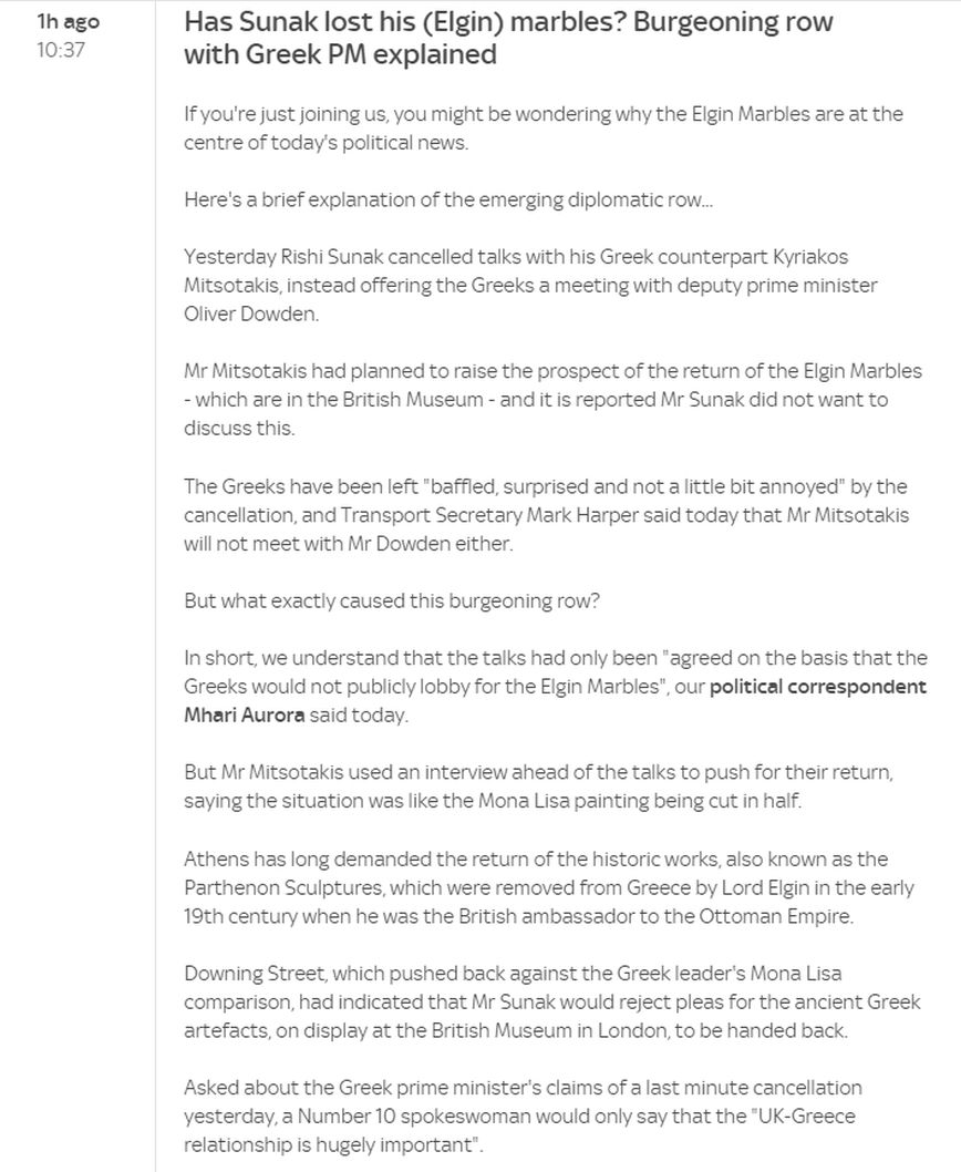 Αποκαλυπτικό είναι το βρετανικό Sky News για το «διπλωματικό φάουλ» του Ρίσι Σούνακ και την απρεπή του στάση απέναντι στον Κυριάκο Μητσοτάκη. Πολιτική συντάκτρια σημειώνει πως οι συνομιλίες ανάμεσα στις δύο πλευρές είχαν συμφωνηθεί με την προϋπόθεση ότι η ελληνική πλευρά δεν θα ασκούσε δημόσια πιέσεις για την επιστροφή των Γλυπτών του Παρθενώνα.