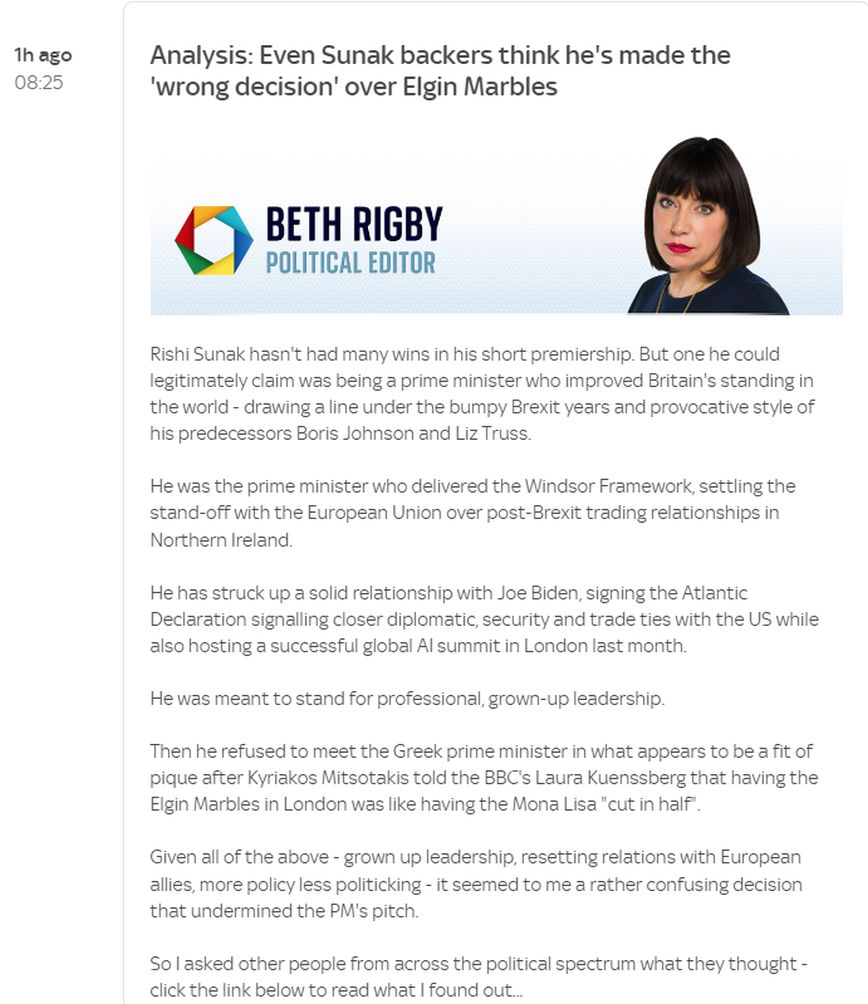 «Ακόμη και οι υποστηρικτές του Ρίσι Σούνακ πιστεύουν ότι πήρε τη «λάθος απόφαση» για τα Γλυπτά του Παρθενώνα» είναι ο τίτλος ανάλυσης του βρετανικού Sky News στον απόηχο του διπλωματικού επεισοδίου μετά την ακύρωση της συνάντησης από τον βρετανό πρωθυπουργό με τον Κυριάκο Μητσοτάκη.