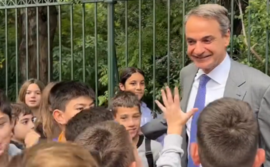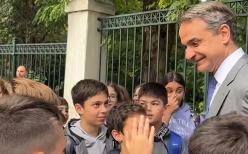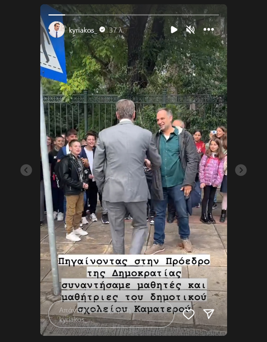 Το στιγμιότυπο ανάρτησε ο κ. Μητσοτάκης σε story του στο Instagram, αναφέροντας: «Πηγαίνοντας στην Πρόεδρο της Δημοκρατίας συναντήσαμε μαθητές και μαθήτριες του δημοτικού σχολείου Καματερού».