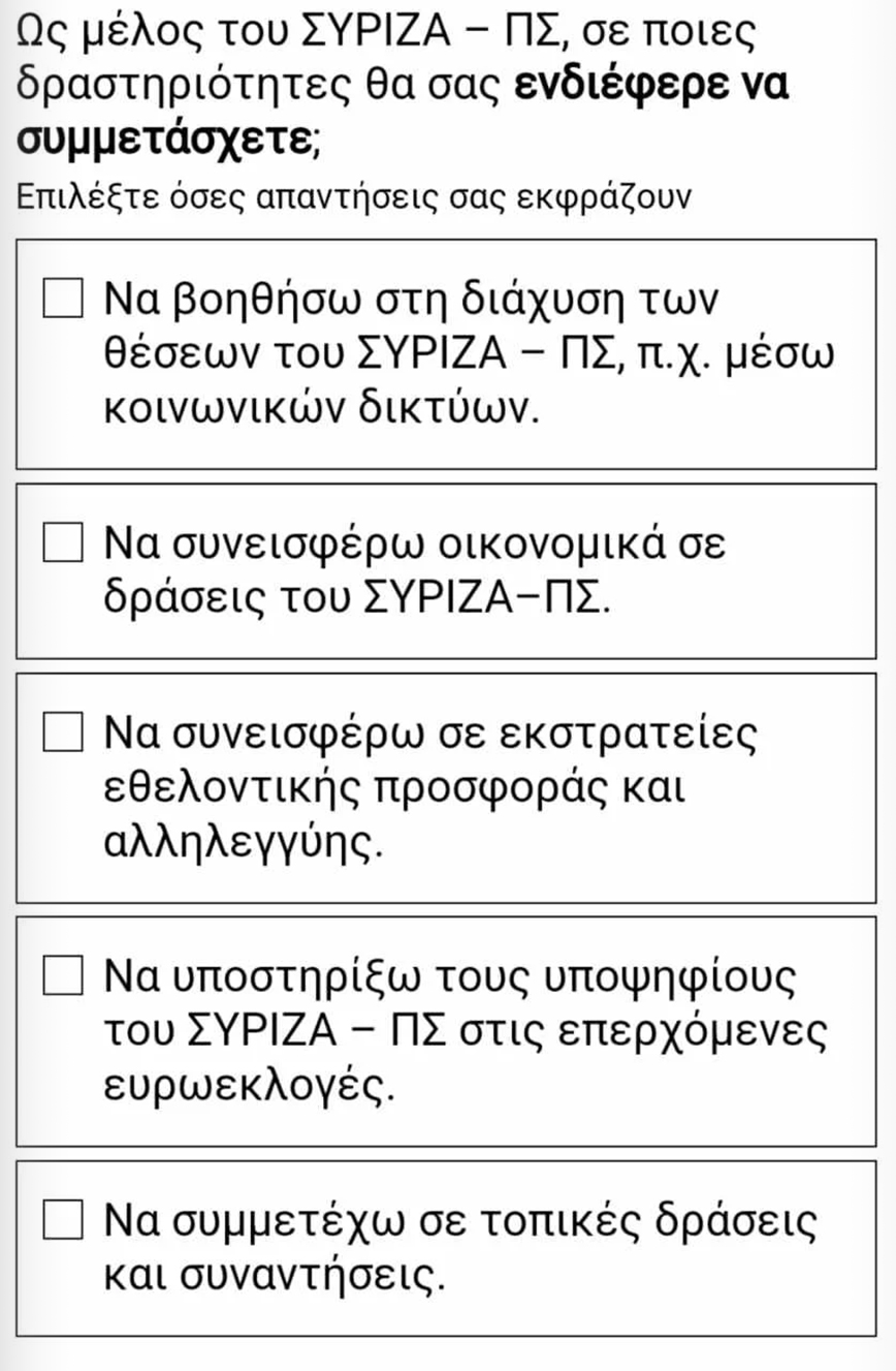 Σε περίπτωση που κάποιο άτομο κάνει ηλεκτρονική εγγραφή στον ΣΥΡΙΖΑ, θα κληθεί να απαντήσει στις εξής ερωτήσεις: