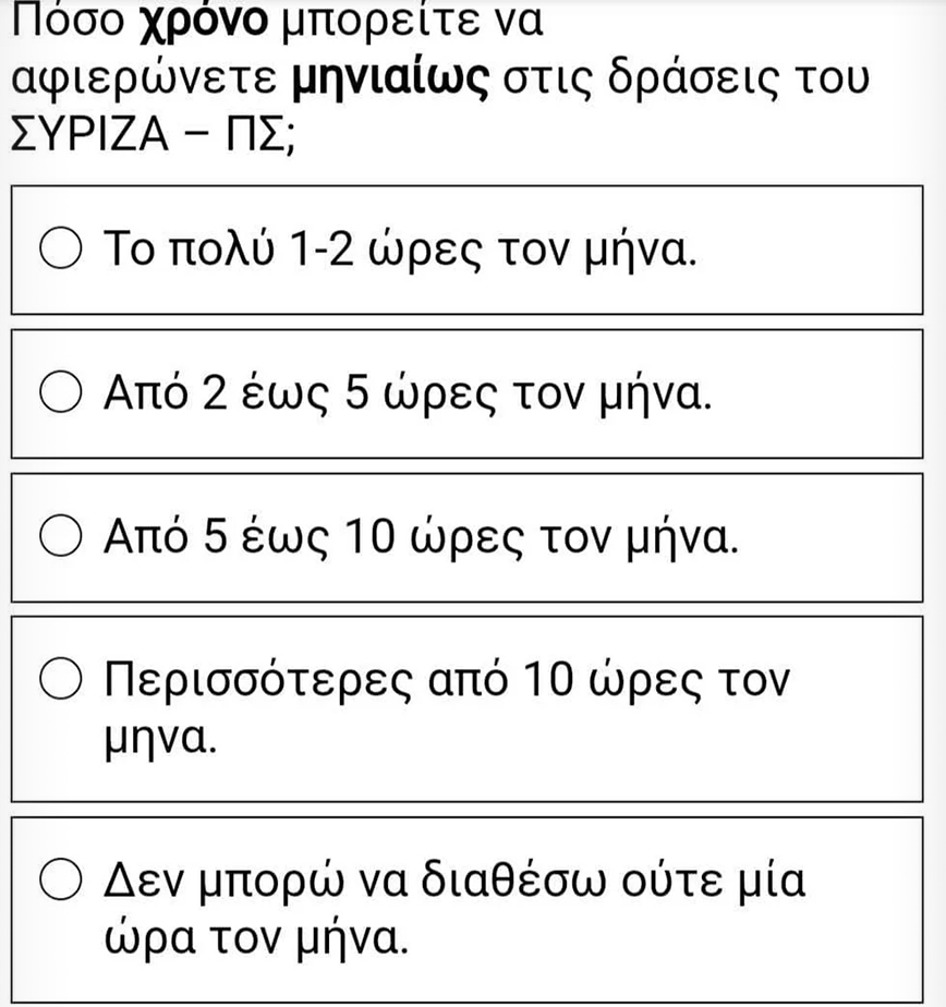 - Πόσο χρόνο μπορείτε να αφιερώνετε μηνιαίως στις δράσεις του ΣΥΡΙΖΑ – ΠΣ;