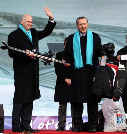 Φορώντας το γαλάζιο κασκόλ των αγώνων εμφανίστηκε ο έλληνας πρωθυπουργός στο στάδιο του Ερζερούμ, όπου θα φιλοξενηθούν οι χειμερινοί πανεπιστημιακοί αγώνες. Ο πρωθυπουργός της Τουρκίας, Ταγίπ Ερντογάν, αμέσως μετά τις ομιλίες προσέφερε ορισμένα συμβολικά δώρα (μπουφάν και πέδιλα του σκι) στον κ. Παπανδρέου. Η εκδήλωση στο στάδιο έκλεισε με μουσική του έλληνα συνθέτη Σταμάτη Σπανουδάκη.