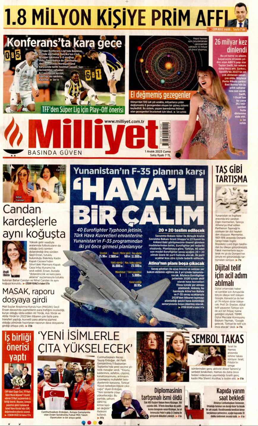 Ειδικότερα, ο ανταποκριτής του ΣΚΑΪ από την Κωνσταντινούπολη επεσήμανε πως το σημερινό πρωτοσέλιδο της τουρκικής εφημερίδας Μillyet κάνει λόγο για «Ντρίπλα το σχέδιο της Ελλάδας για τα F-35».