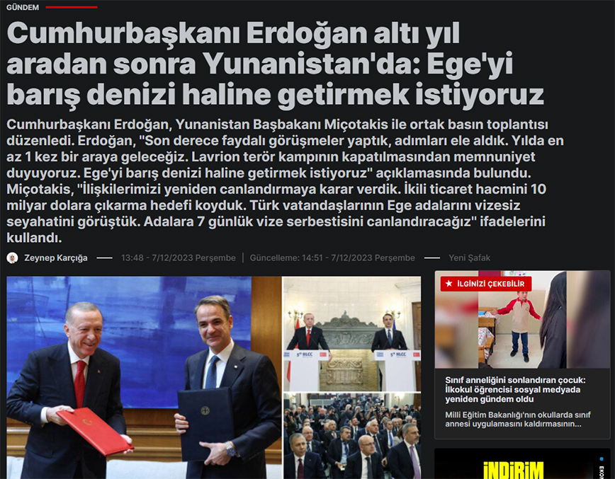 Hurriyet: «Ιστορική επίσκεψη στην Αθήνα – Κοινή δήλωση Ερντογάν και Μητσοτάκη: Δεν υπάρχει πρόβλημα, που δεν μπορούμε να λύσουμε μεταξύ μας»