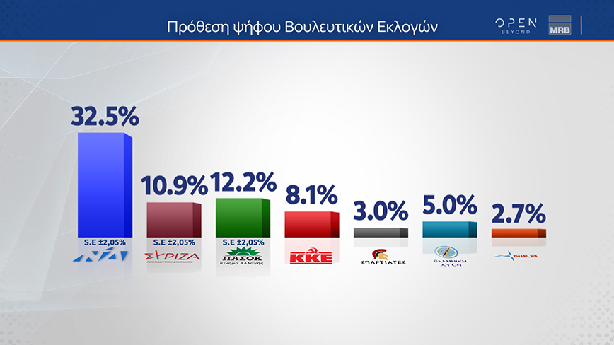 Στην πρόθεση ψήφου της έρευνας η Νέα Δημοκρατία βρίσκεται στο 32,5%, το ΠΑΣΟΚ στο 12,2%, ο ΣΥΡΙΖΑ στο 10,9%, το ΚΚΕ στο 8,1%, η Ελληνική Λύση στο 5%, η Πλεύση Ελευθερίας στο 3,3%, οι Σπαρτιάτες στο 3%, η Νίκη στο 2,7%, το ΜέΡΑ25 στο 2,2% ενώ η Νέα Αριστερά στο 2,1%. Δεν αποφάσισα/δεν απαντώ δηλώνει το 11,1%, Λευκό, άκυρο ή αποχή δηλώνει το 5,2% και «άλλο κόμμα» το 1,7%.