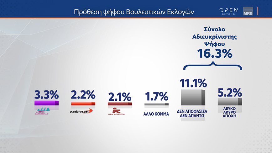 Προβάδισμα μεγαλύτερο της μονάδας διατηρεί το ΠΑΣΟΚ που καταγράφεται στη δεύτερη θέση, πάνω από τον ΣΥΡΙΖΑ και στις τάσεις της MRB που παρουσίασε το OPEN.