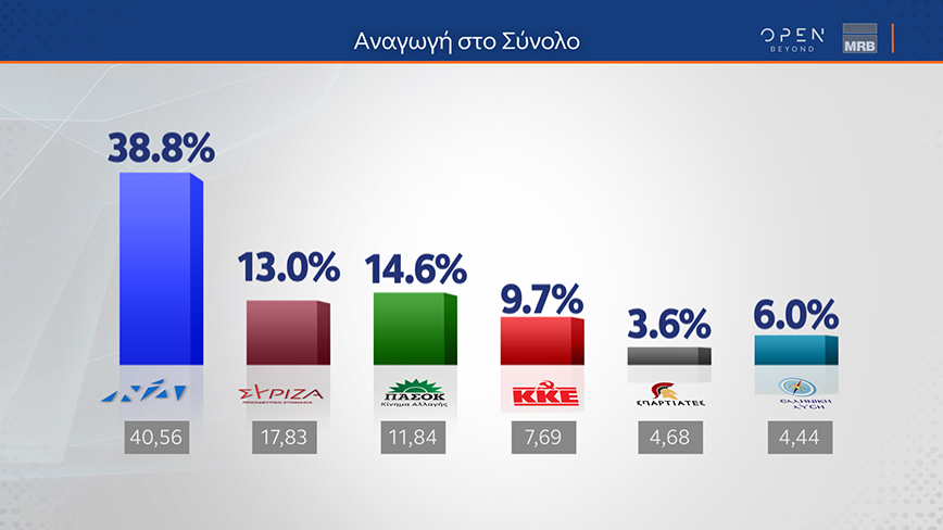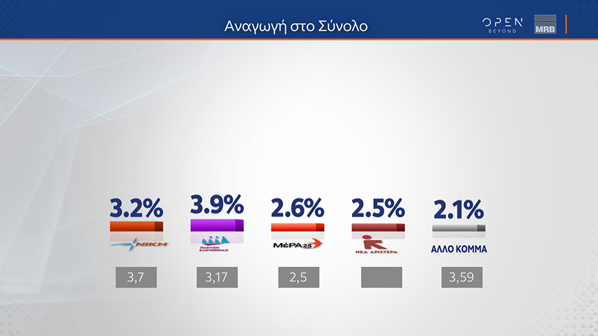Στην αναγωγή τα αντίστοιχα ποσοστά διαμορφώνονται ως εξής: Νέα Δημοκρατία 38,8%, το ΠΑΣΟΚ 14,6% και ο ΣΥΡΙΖΑ 13%. Ακολουθεί το ΚΚΕ με 9,7% και η Ελληνική Λύση στο 6%. Πέριξ του ορίου εκπροσώπησης στη Βουλή κινούνται η Πλεύση Ελευθερίας με 3,9%, οι Σπαρτιάτες με 3,6% και η Νίκη με 3,2%, ενώ κάτω από το όριο βρίσκονται το ΜέΡΑ25 με 2,6% και η Νέα Αριστερά με 2,5%.