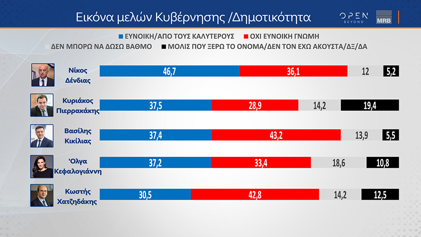 Τέλος στη δημοφιλία των υπουργών προηγείται ο υπουργός Άμυνας Νίκος Δένδιας με 46,7%, ακολουθεί ο υπουργός Παιδείας Κυριάκος Πιερρακάκης με 37,5%, ο υπουργός Κλιματικής Κρίσης και Πολιτικής Προστασίας Βασίλης Κικίλιας με 37,4%, η υπουργός Τουρισμού Όλγα Κεφαλογιάννη με 37,2% και πέμπτος ο υπουργός Οικονομικών Κωστής Χατζηδάκης με 30,5%.