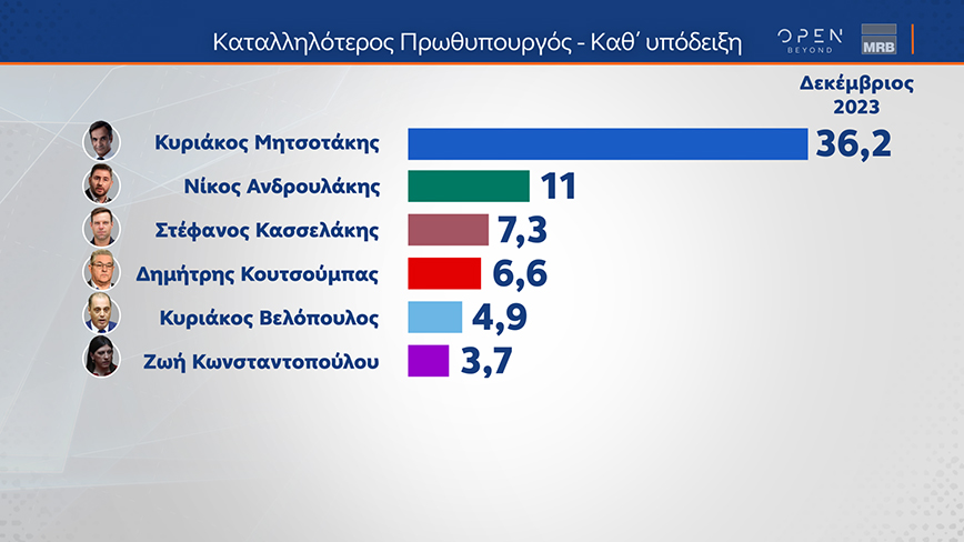 Καταλληλότερος πρωθυπουργός εμφανίζεται ο Κυριάκος Μητσοτάκης με 36,2% και ακολουθεί ο Νίκος Ανδρουλάκης με 11%. Ο Στέφανος Κασσελάκης καταγράφει 7,3% και ο Δημήτρης Κουτσούμπας 6,6%. Ο Κυριάκος Βελόπουλος δηλώνει το 4,9% και η Ζωή Κωνσταντοπούλου το 3,7%.