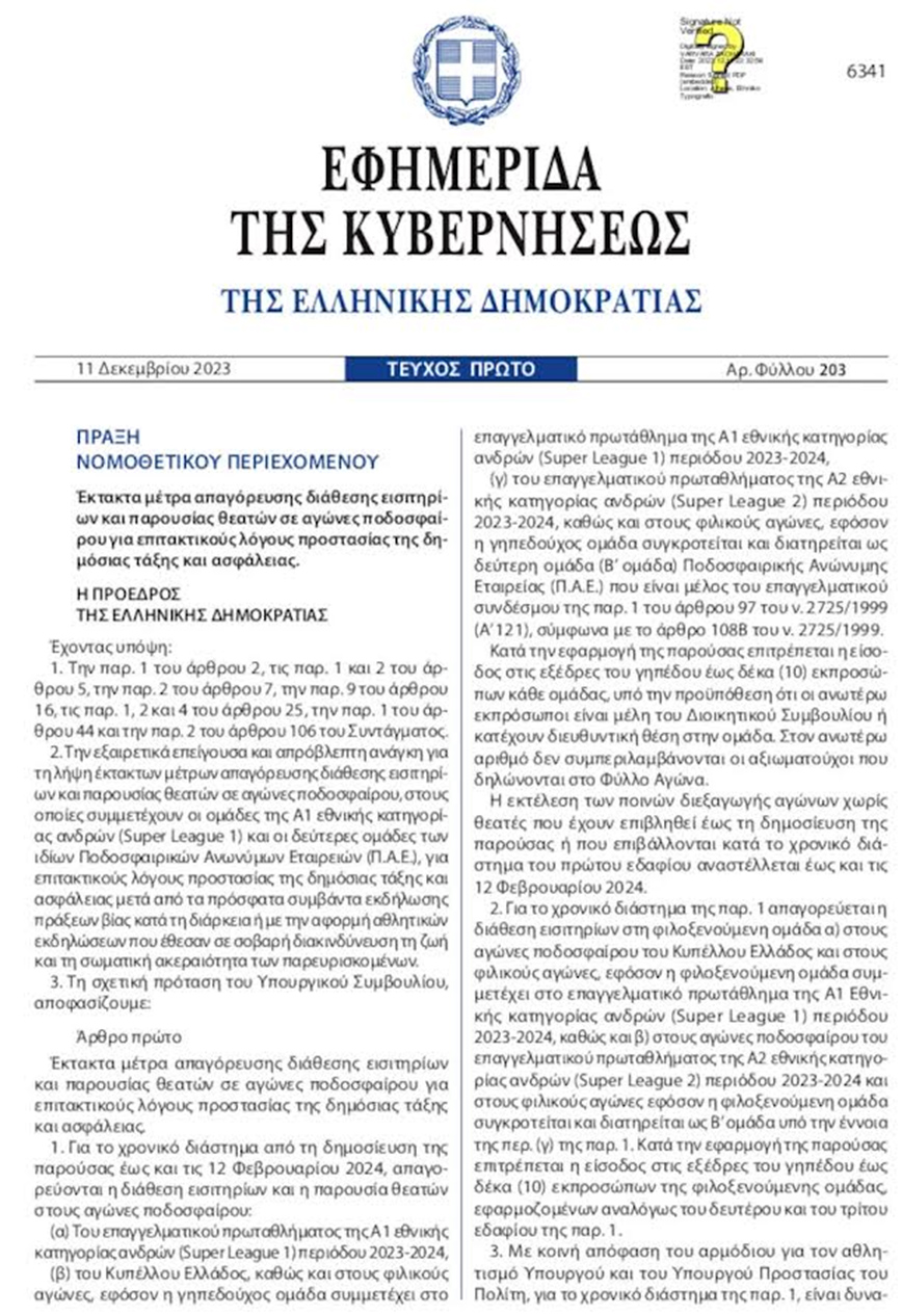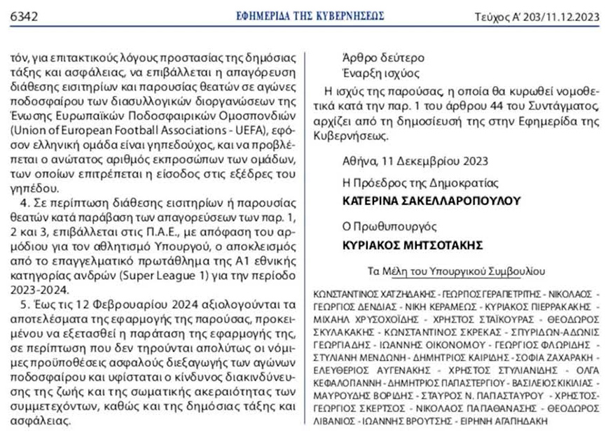 Έκτακτα μέτρα απαγόρευσης διάθεσης εισιτηρίων και παρουσίας θεατών σε αγώνες ποδοσφαίρου για επιτακτικούς λόγους προστασίας της δημόσιας τάξης και ασφάλειας. Για το χρονικό διάστημα από τη δημοσίευση της παρούσας έως και τις 12 Φεβρουαρίου 2024, απαγορεύονται η διάθεση εισιτηρίων και η παρουσία θεατών στους αγώνες ποδοσφαίρου: