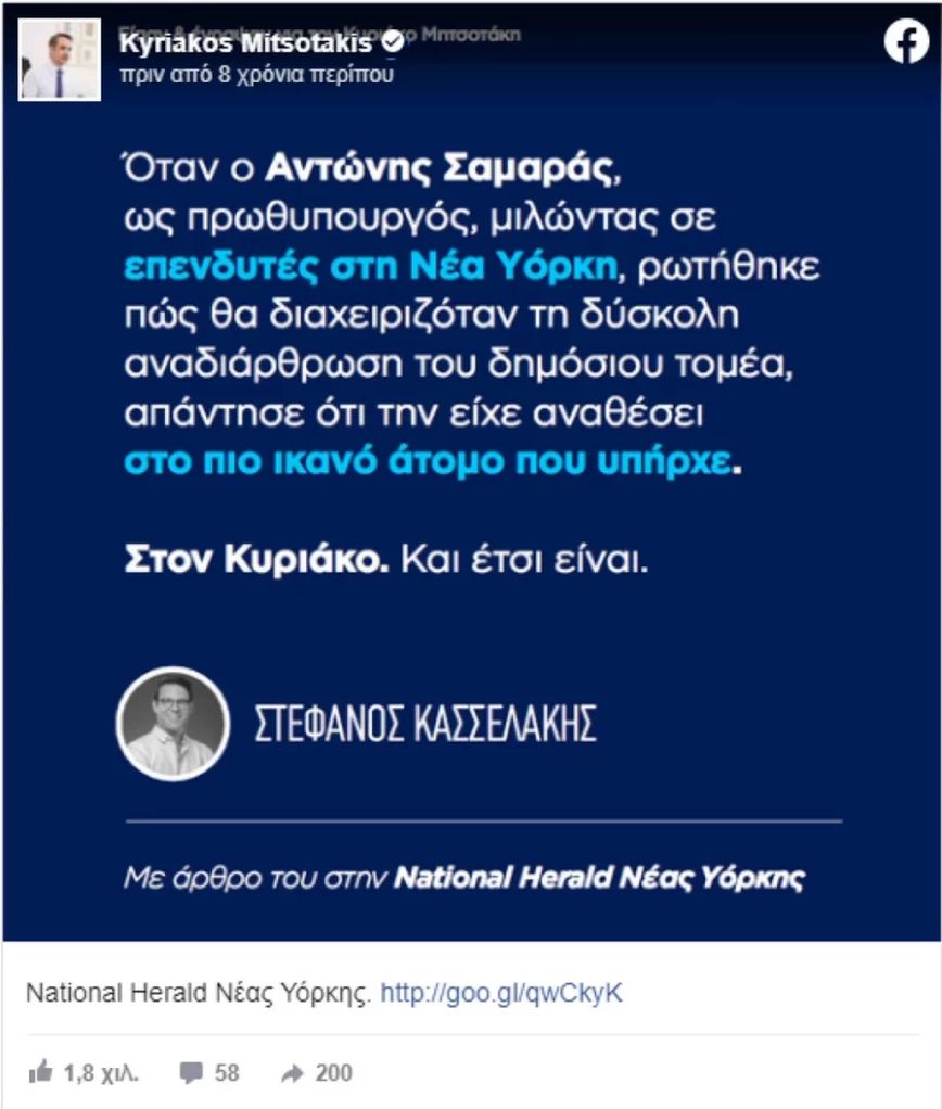 Ειδικότερα, ο κ. Μητσοτάκης είχε προτάξει στον λογαριασμό του στα μέσα κοινωνικής δικτύωσης τότε τη φράση του κ. Κασσελάκη: «Όταν ο Αντώνης Σαμαράς, ως πρωθυπουργός, μιλώντας σε επενδυτές στη Νέα Υόρκη, ρωτήθηκε πώς θα διαχειριζόταν τη δύσκολη αναδιάρθρωση του δημόσιου τομέα, απάντησε ότι την είχε αναθέσει στο πιο ικανό άτομο που υπήρχε. Στον Κυριάκο Μητσοτάκη. Και έτσι είναι»!
