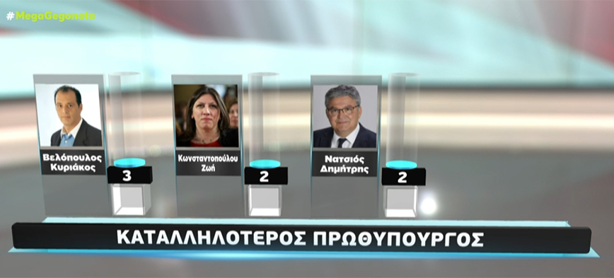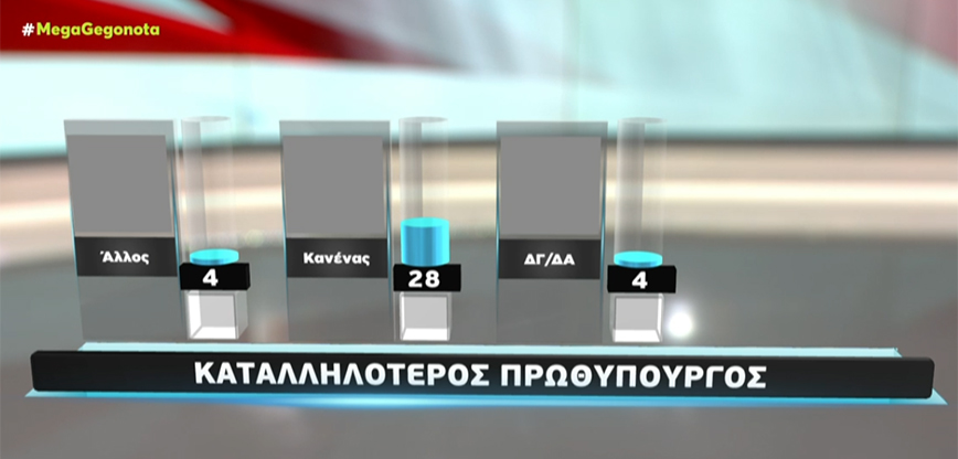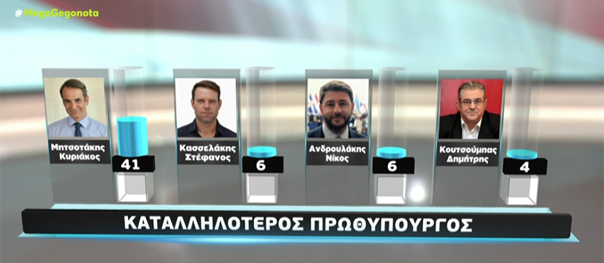 Στην καταλληλότητα για πρωθυπουργός, ο Κυριάκος Μητσοτάκης παίζει με μοναδικό αντίπαλο τον «κανέναν». Ο πρωθυπουργός συγκεντρώνει 41%, ενώ η απάντηση «κανένας» 28%. Ακολουθεί ο Στέφανος Κασσελάκης και ο Νίκος Ανδρουλάκης ισόπαλοι με 6%. Ο Δημήτρης Κουτσούμπας βρίσκεται στο 4%, ο Κυριάκος Βελόπουλος στο 3%, ενώ Ζωή Κωνσταντοπούλου και Δημήτρης Νατσιός βρίσκονται στο 2%.