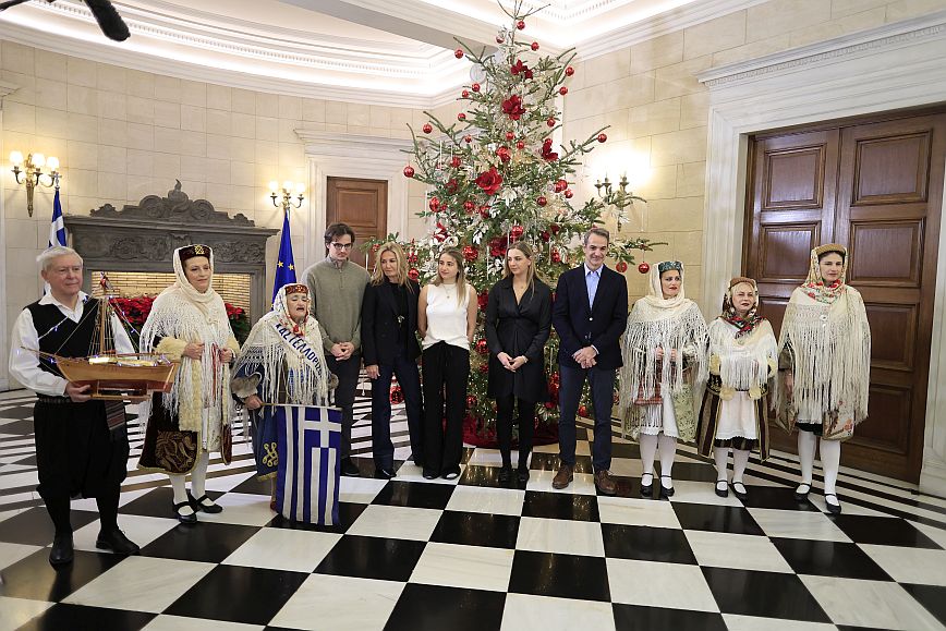 Παραδοσιακά χριστουγεννιάτικα κάλαντα άκουσε ο Κυριάκος Μητσοτάκης στο Μέγαρο Μαξίμου από τις γυναίκες του Πολιτιστικού Συλλόγου Καστελόριζου, της Πανθρακικής Ομοσπονδίας Νότιας Ελλάδας και την Παναρκαδική Ομοσπονδία.