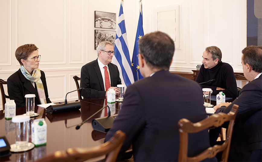 Ο πρωθυπουργός Κυριάκος Μητσοτάκης συναντήθηκε σήμερα με την πρόεδρο του εποπτικού συμβουλίου της Ευρωπαϊκής Κεντρικής Τράπεζας, Claudia Buch, και τον πρόεδρο του ενιαίου συμβουλίου εξυγίανσης (SRB) Dominique Laboureix, στο Μέγαρο Μαξίμου.