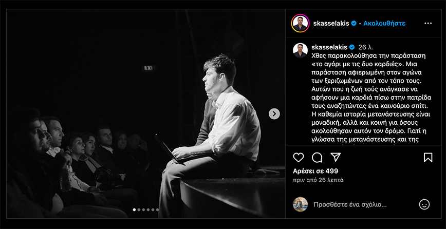 Τη θεατρική παράσταση «Το αγόρι με τις δυο καρδιές» παρακολούθησε χθες το βράδυ ο πρόεδρος του ΣΥΡΙΖΑ – Προοδευτική Συμμαχία, Στέφανος Κασσελάκης, και όπως έγραψε σήμερα στο Instagram, παραθέτοντας και στις σχετικές φωτογραφίες πρόκειται για «μια παράσταση αφιερωμένη στον αγώνα των ξεριζωμένων από τον τόπο τους. Αυτών που η ζωή τους ανάγκασε να αφήσουν μια καρδιά πίσω στην πατρίδα τους αναζητώντας ένα καινούριο σπίτι. Η καθεμία ιστορία μετανάστευσης είναι μοναδική, αλλά και κοινή για όσους ακολούθησαν αυτόν τον δρόμο. Γιατί η γλώσσα της μετανάστευσης και της προσφυγιάς είναι πανανθρώπινη, γεμάτη πόνο, αγωνία, ελπίδα και αγάπη».