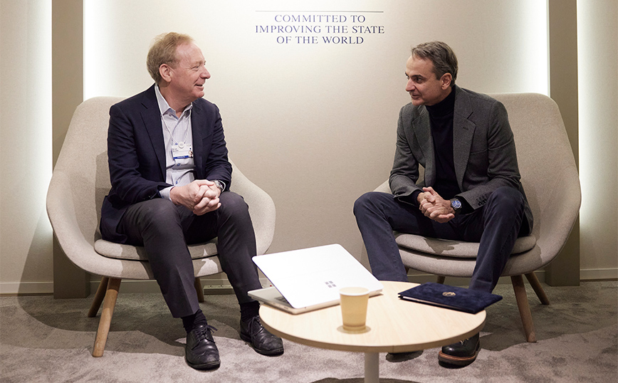 Ο πρωθυπουργός Κυριάκος Μητσοτάκης συναντήθηκε σήμερα με τον πρόεδρο της Microsoft, Brad Smith, στο πλαίσιο του Παγκόσμιου Οικονομικού Φόρουμ στο Νταβός της Ελβετίας.