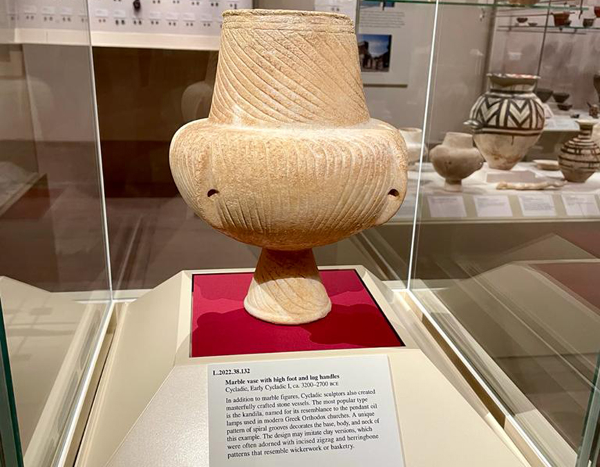 Μεταξύ άλλων εκτίθενται και μερικά πήλινα αγγεία όπως ένα τηγανόσχημο σκεύος, και πολλά ακέραια μαρμάρινα αγγεία, όπως φιάλες, λεκάνες, κύπελλα, παλέττες και οι χαρακτηριστικές «καντήλες» αλλά και μία μοναδική πυξίδα από χλωριτικό σχιστόλιθο, της ιδίας περιόδου.