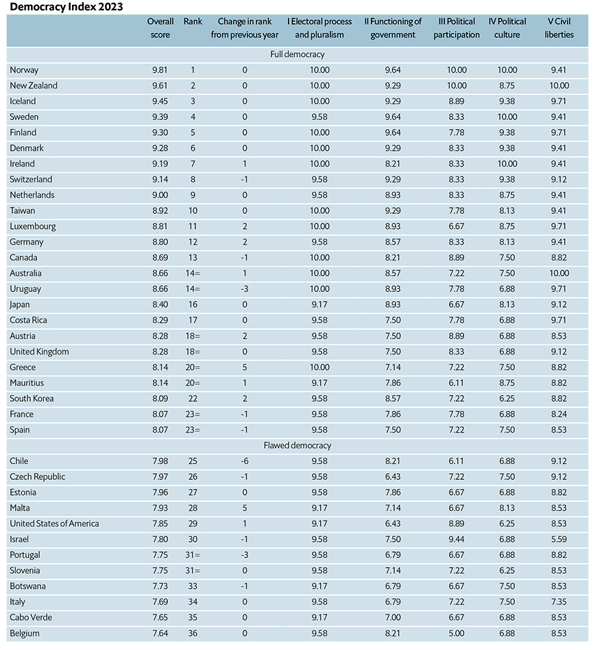 Η χώρα μας ήταν μία από τις ελάχιστες δημοκρατίες που βελτίωσαν τον βαθμό τους σε σχέση με το 2022, κατά 0,17 μονάδες. Πέτυχε μάλιστα απόλυτο 10 στην υποκατηγορία για τη διεξαγωγή εκλογών και τον πλουραλισμό, επίτευγμα που μοιράζονται μόνο δώδεκα άλλες χώρες, και 8,82 στην υποκατηγορία των πολιτικών ελευθεριών.