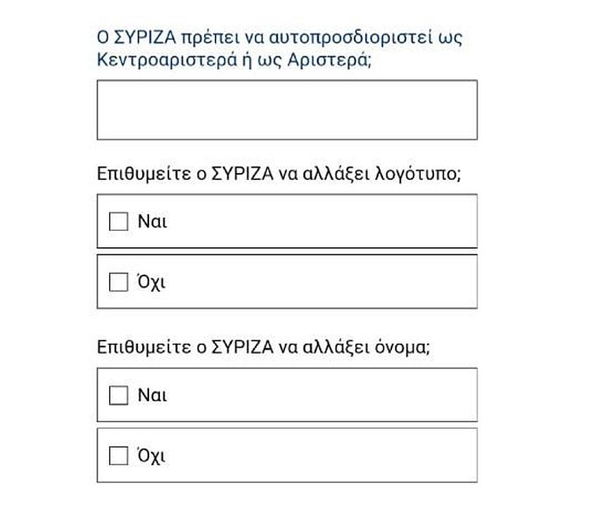 Πάντως είναι χαρακτηριστικές οι δύο ερωτήσεις που περιλαμβάνει ο πρόεδρος του ΣΥΡΙΖΑ στο ερωτηματολόγιο που απευθύνει.
