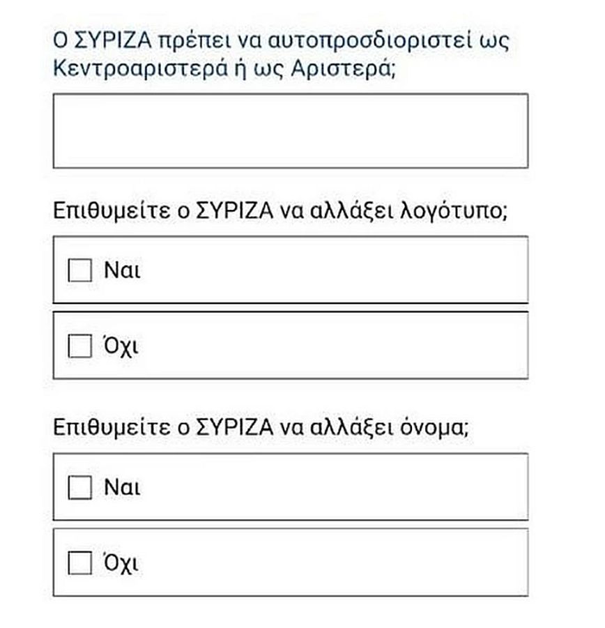Σε αυτό ήταν χαρακτηριστικές οι δύο ερωτήσεις οι οποίες είχαν να κάνουν με το όνομα και το λογότυπο του κόμματος.