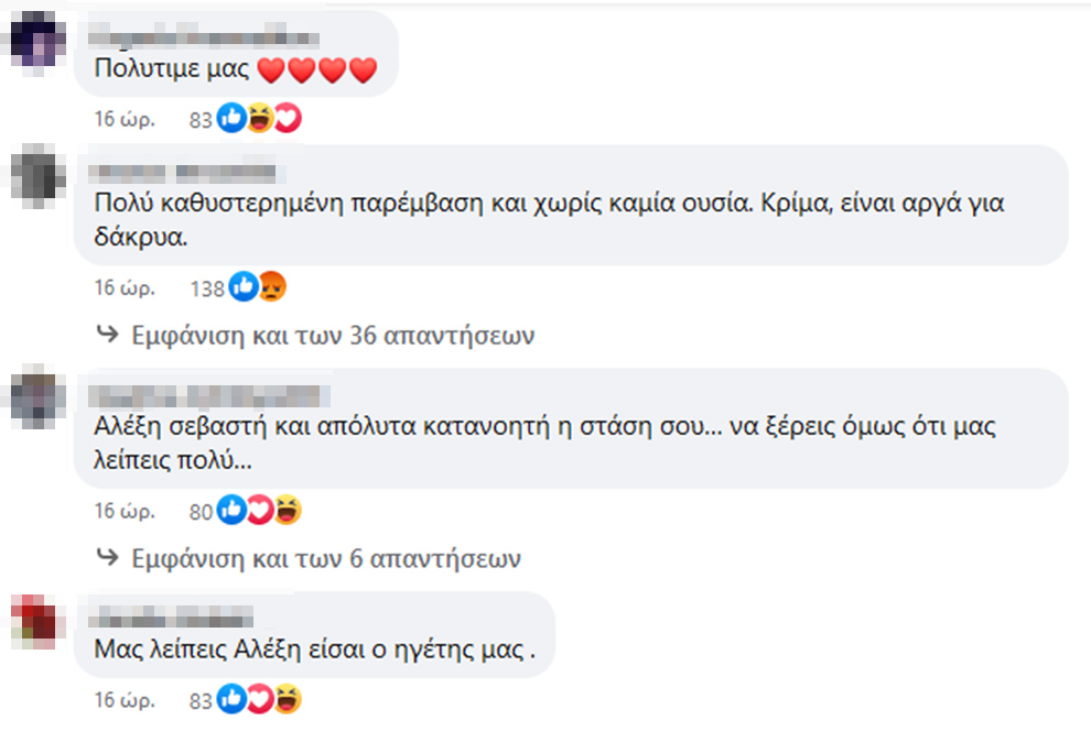 Φυσικά, εκατοντάδες ήταν και τα σχόλια στην ανάρτηση του Αλέξη Τσίπρα στο Facebook. Για την ακρίβεια, η ανάρτηση του πρώην προέδρου του ΣΥΡΙΖΑ μετρά ήδη πάνω από 2.000 σχόλια.