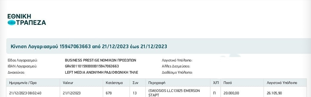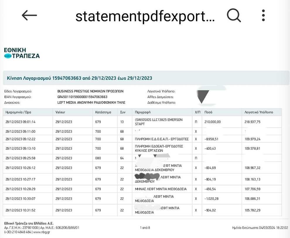 •Το δάνειο του Στέφανου Κασσελάκη μπήκε στον λογαριασμό της Left Media ΑΕ το απόγευμα της Παρασκευής 29/12/2023, ενώ το Δώρο Χριστουγέννων των εργαζομένων στα ΜΜΕ είχε καταβληθεί ήδη την Πέμπτη 21/12/2023 και η μισθοδοσία των εργαζομένων για Δεκέμβριο την Παρασκευή το πρωί 29/12/2023.