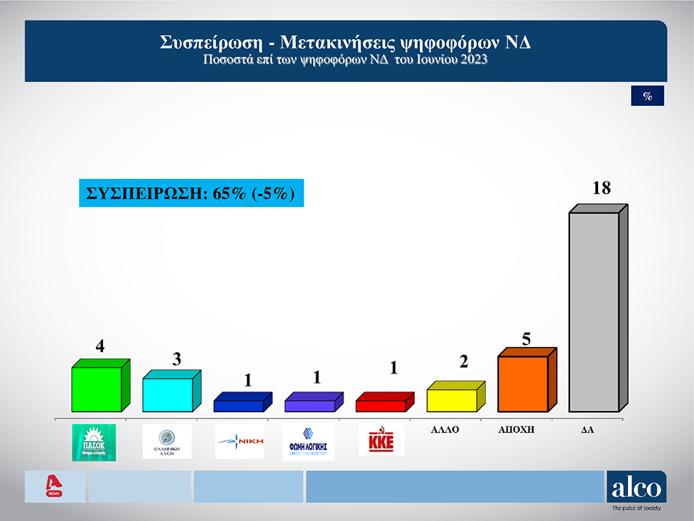 Σε ό,τι αφορά στη συσπείρωση των κομμάτων, η Νέα Δημοκρατία εμφανίζει αρκετά πεσμένο ποσοστό με 65%. Το κυβερνών κόμμα δείχνει να χάνει 4% της δύναμής του προς το ΠΑΣΟΚ, 3% προς την Ελληνική Λύση, 1% προς τη Νίκη, 1% προς το ΚΚΕ και 18% των ψηφοφόρων της ΝΔ του 2023, δεν απαντούν τι θα ψηφίσουν.