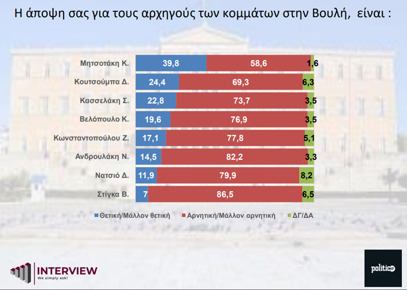 Αναφορικά με τη δημοφιλία των αρχηγών των κομμάτων, ο πρωθυπουργός Κυριάκος Μητσοτάκης εξακολουθεί να διατηρεί τα πρωτεία έναντι των υπολοίπων πολιτικών αρχηγών.