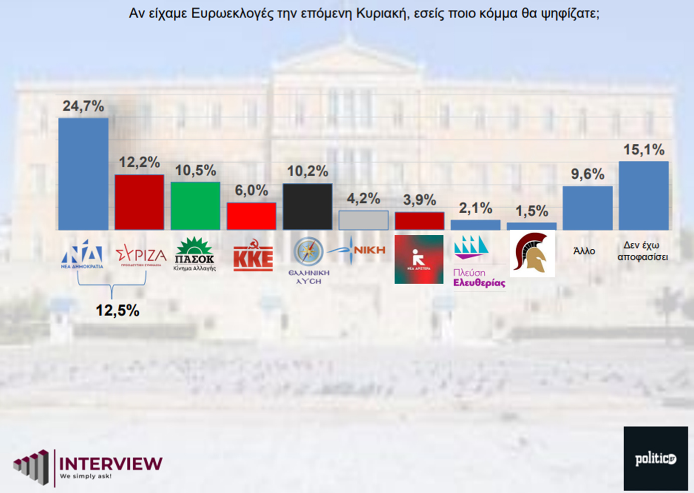 Με 28,5% προηγείται η Νέα Δημοκρατία στην πρόθεση ψήφου σε δημοσκόπηση της Interview για την ιστοσελίδα politic και βρίσκεται 16,3 μονάδες μπροστά από τον ΣΥΡΙΖΑ που είναι στη δεύτερη θέση. Τρίτο κόμμα είναι το ΠΑΣΟΚ με ποσοστό 10,5%.
