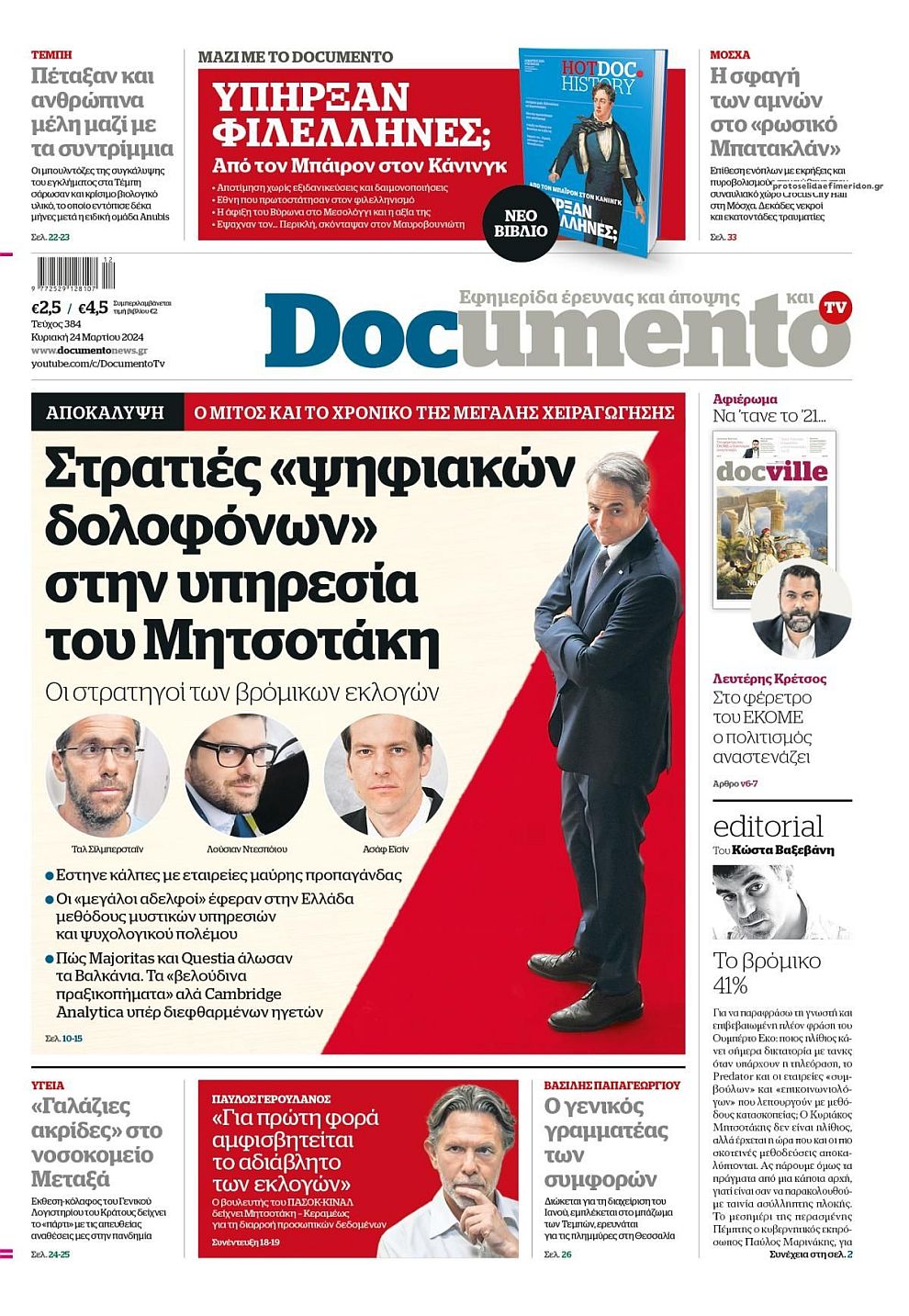 Να πούμε ότι το αυριανό δημοσίευμα στο οποίο αναφέρεται ο κυβερνητικός εκπρόσωπος είναι η εφημερίδα Documento η οποία με πρωτοσέλιδο τίτλο «Στρατιές «ψηφιακών δολοφόνων» στην υπηρεσία του Μητσοτάκη» αναφέρεται «στον τρόπο επιβολής της πλήρους κυριαρχίας του Κυριάκου Μητσοτάκη στο ελληνικό πολιτικό σύστημα»