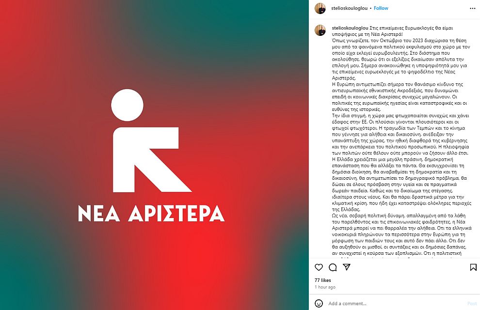 Στο διάστημα που ακολούθησε, θεωρώ ότι οι εξελίξεις δικαίωσαν απόλυτα την επιλογή μου. Σήμερα ανακοινώθηκε η υποψηφιότητά μου για τις επικείμενες ευρωεκλογές με το ψηφοδέλτιο της Νέας Αριστεράς.