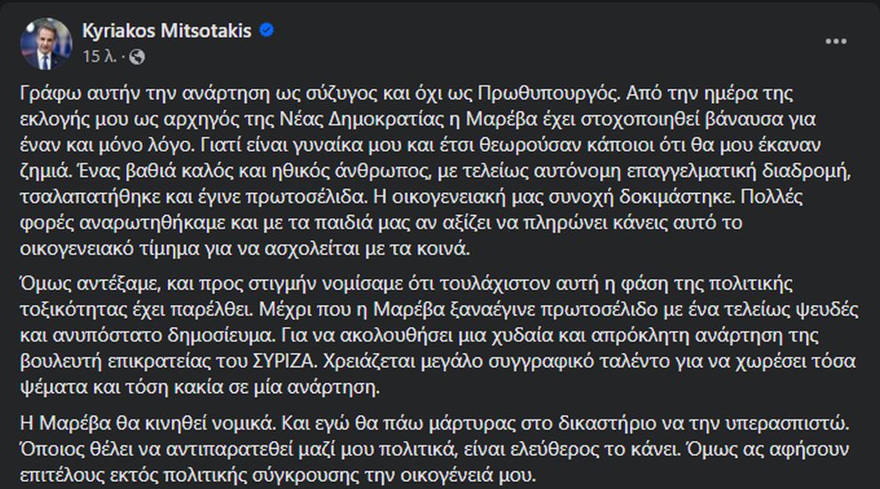 «Γράφω αυτήν την ανάρτηση ως σύζυγος και όχι ως Πρωθυπουργός. Από την ημέρα της εκλογής μου ως αρχηγός της Νέας Δημοκρατίας η Μαρέβα έχει στοχοποιηθεί βάναυσα για έναν και μόνο λόγο. Γιατί είναι γυναίκα μου και έτσι θεωρούσαν κάποιοι ότι θα μου έκαναν ζημιά. Ένας βαθιά καλός και ηθικός άνθρωπος, με τελείως αυτόνομη επαγγελματική διαδρομή, τσαλαπατήθηκε και έγινε πρωτοσέλιδα. Η οικογενειακή μας συνοχή δοκιμάστηκε. Πολλές φορές αναρωτηθήκαμε και με τα παιδιά μας αν αξίζει να πληρώνει κάνεις αυτό το οικογενειακό τίμημα για να ασχολείται με τα κοινά.
