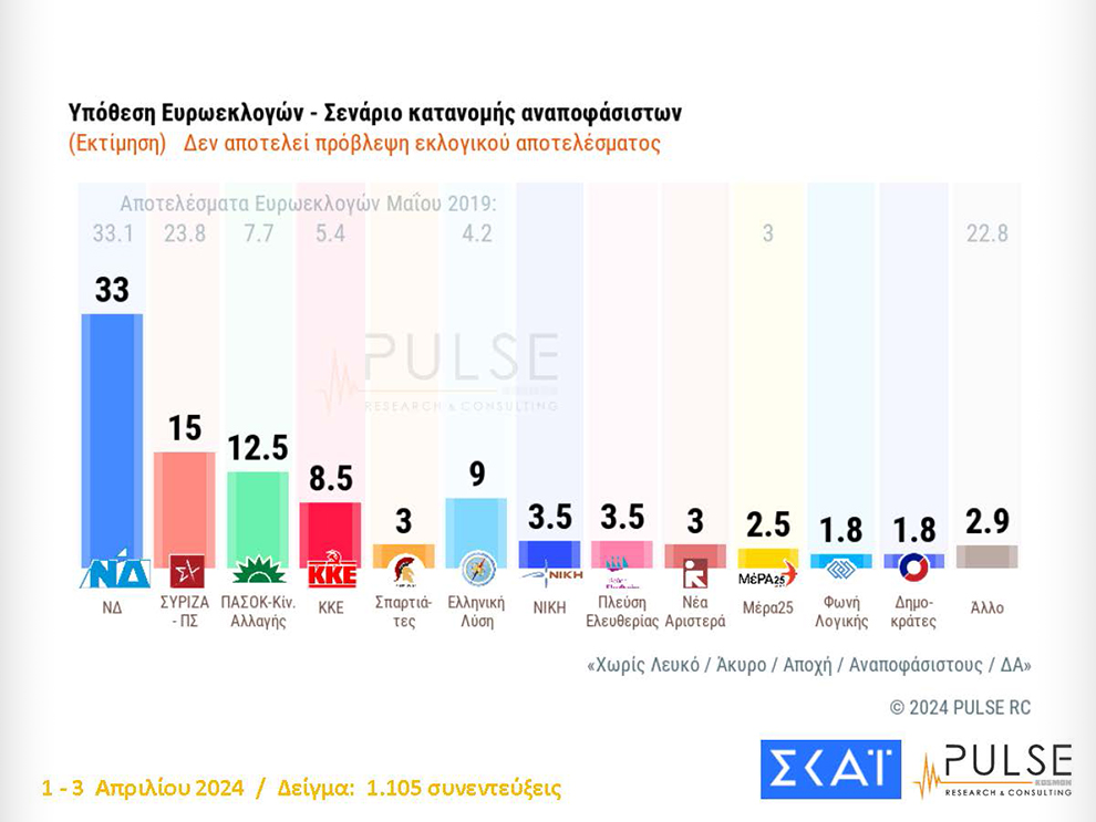 Σταθερά πρώτη η Νέα Δημοκρατία, εδραιώνεται στη δεύτερη θέση ο ΣΥΡΙΖΑ, «ανοίγοντας» τη διαφορά του από το ΠΑΣΟΚ, σύμφωνα με τη δημοσκόπηση της Pulse για τον ΣΚΑΪ και καθώς η αντίστροφη μέτρηση για τις ευρωεκλογές έχει ήδη αρχίσει.