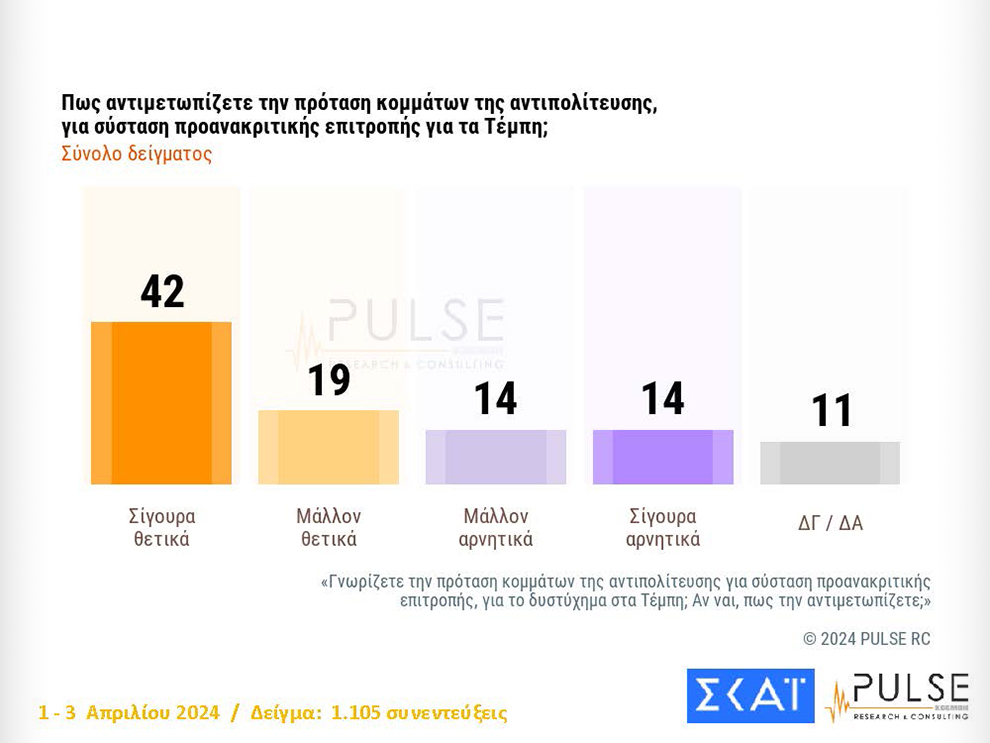 Στον αντίποδα, το 61% λέει «ναι» στη σύσταση προανακριτικής για τη σιδηροδρομική τραγωδία στα Τέμπη και μόλις το 28% λέει «όχι».