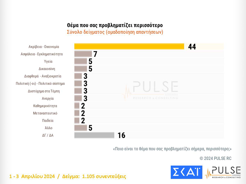 Όσον αφορά στα θέματα που προβληματίζουν την κοινωνία, πρώτο και με μεγάλη διαφορά είναι η ακρίβεια και τα οικονομικά.
