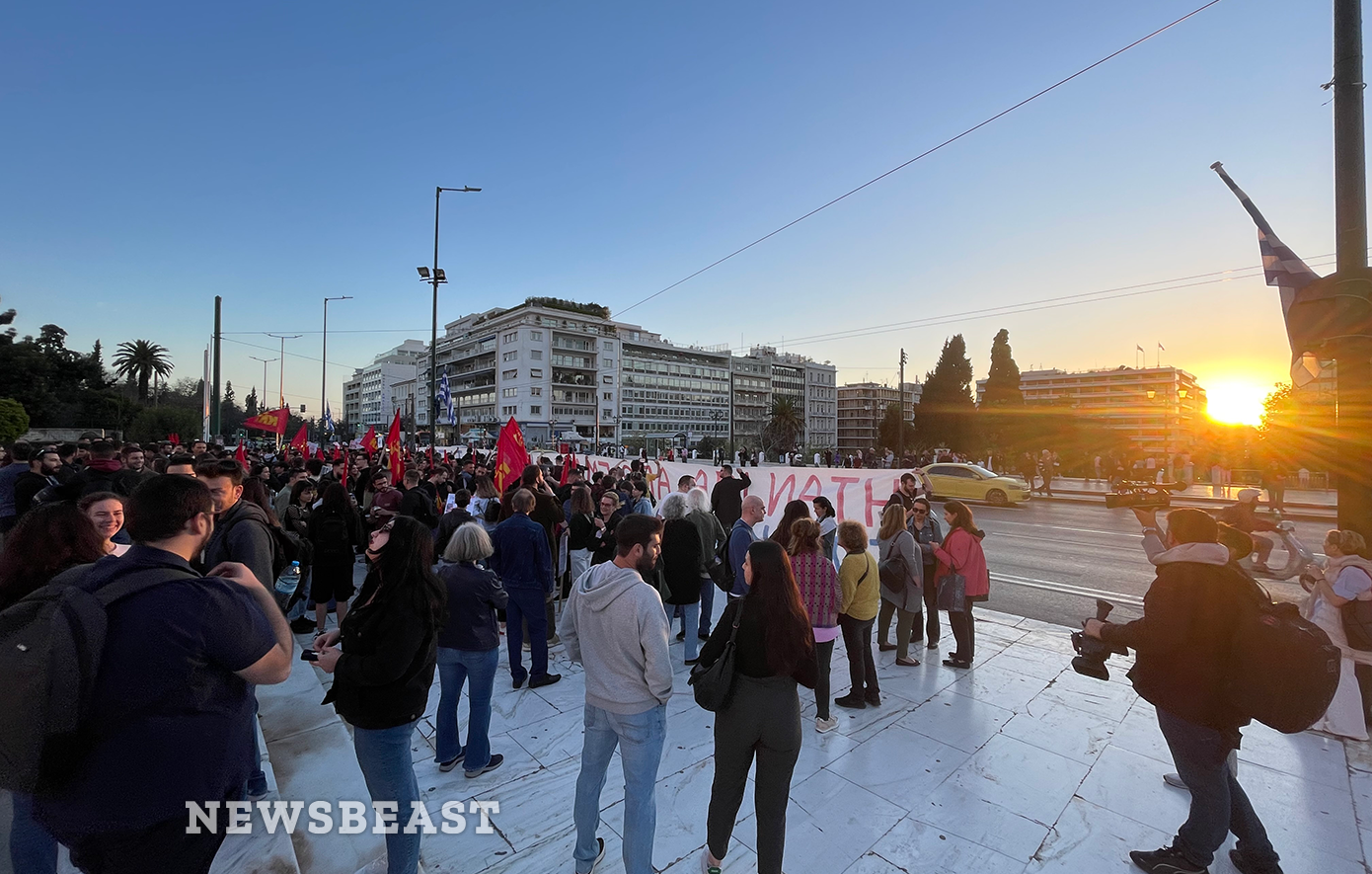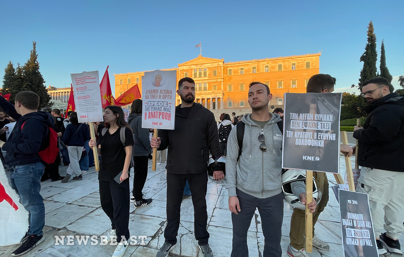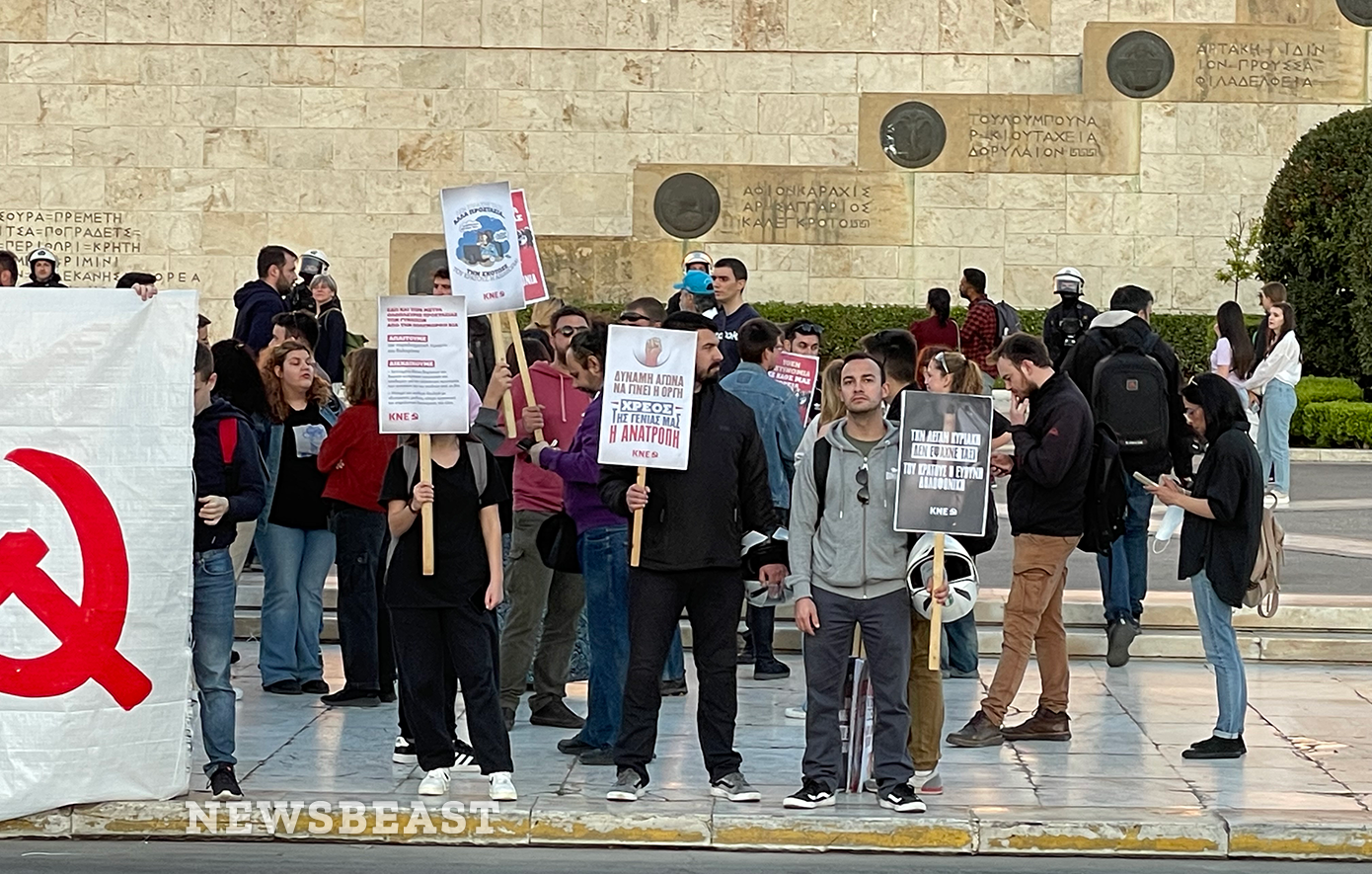 Συγκέντρωση διαμαρτυρίας, έξω από τη Βουλή πραγματοποιούν μέλη της ΚΝΕ, για τη γυναικοκτονία της περασμένης Δευτέρας λίγα μόλις μέτρα από το φυλάκιο του Α/Τ Αγίων Αναργύρων.