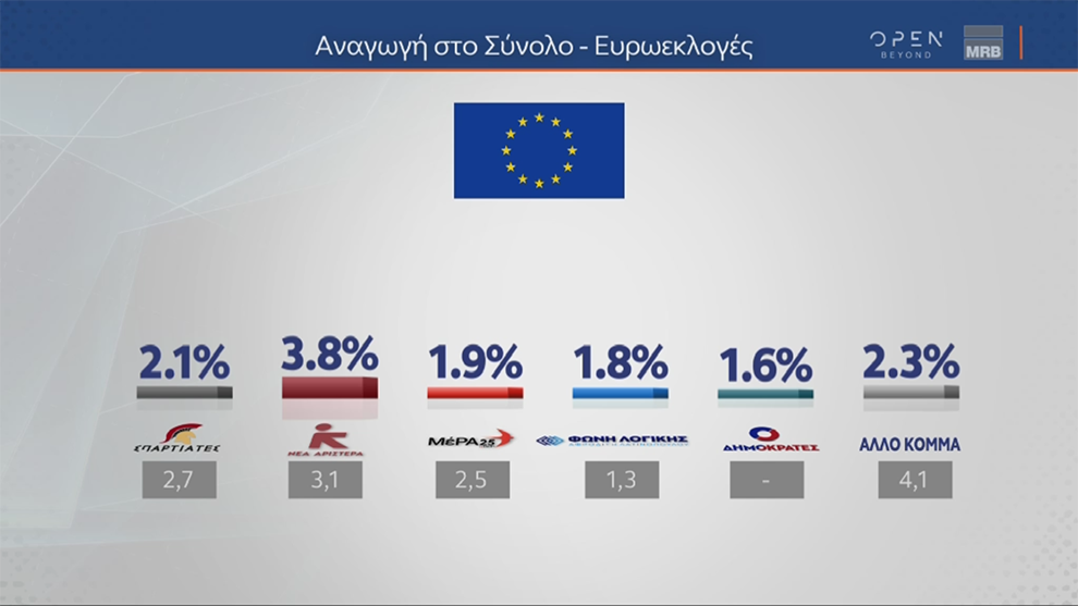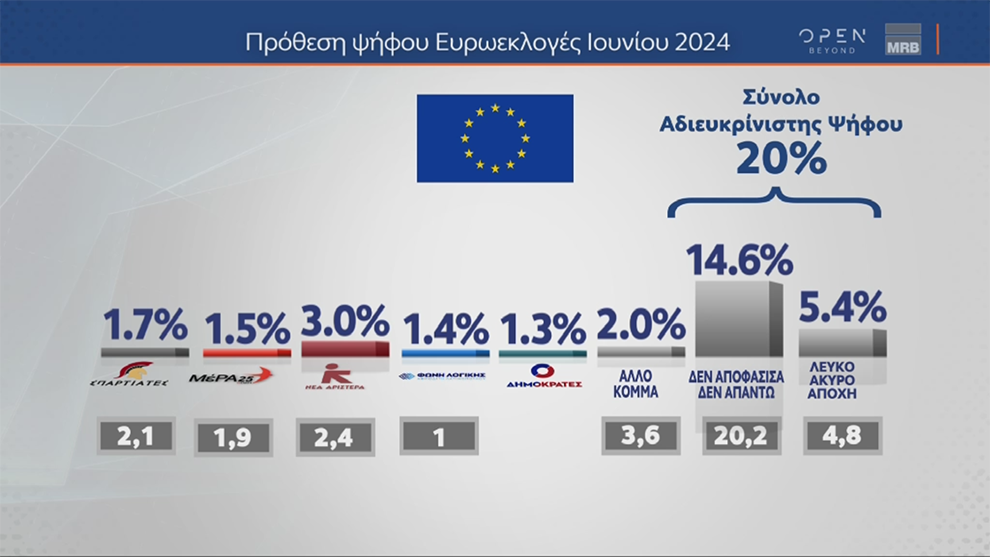 Στο 2,9% εμφανίζεται η Νίκη, οι Σπαρτιάτες στο 1,7%, το ΜέΡΑ25 στο 1,5%, η Φωνή Λογικής στο 1,4% και οι Δημοκράτες στο 1,3%. «Δεν αποφάσισα/δεν απαντώ» δηλώνει το 14,6% των ερωτηθέντων.