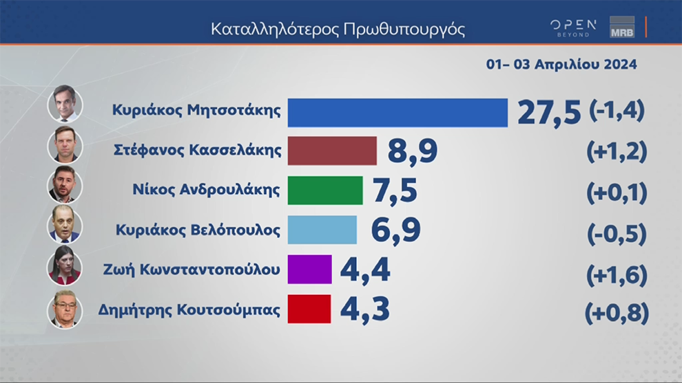 Δημοφιλέστερη επιλογή στην ερώτηση περί καταλληλότητας για πρωθυπουργό καταγράφεται η απάντηση «κανένας», ενώ ακολουθεί ο Κυριάκος Μητσοτάκης με 27,5%. Ο Στέφανος Κασσελάκης στο 8,9%, ο Νίκος Ανδρουλάκης στο 7,5%, ο Κυριάκος Βελόπουλος στο 6,9%, η Ζωή Κωνσταντοπούλου στο 4,4% και ο Δημήτρης Κουτσούμπας στο 4,3%. Πιο χαμηλά ο Δημήτρης Νατσιός στο 1,8%, ο Γιάνης Βαρουφάκης στο 1,5% και ο Αλέξης Χαρίτσης στο 1,2%. Ο Βασίλης Στίγκας συγκεντρώνει μόλις 0,7%.