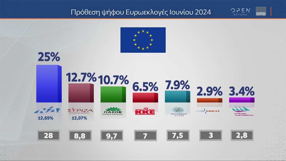 Στην πρόθεση ψήφου της έρευνας, η Νέα Δημοκρατία προηγείται με 25% και ακολουθεί ο ΣΥΡΙΖΑ στο 12,7% και το ΠΑΣΟΚ στο 10,7%. Η Ελληνική Λύση βρίσκεται στο 7,9% ενώ το ΚΚΕ στο 6,5%. Ακολουθεί η Πλεύση Ελευθερίας με 3,4% και η Νέα Αριστερά με 3%.