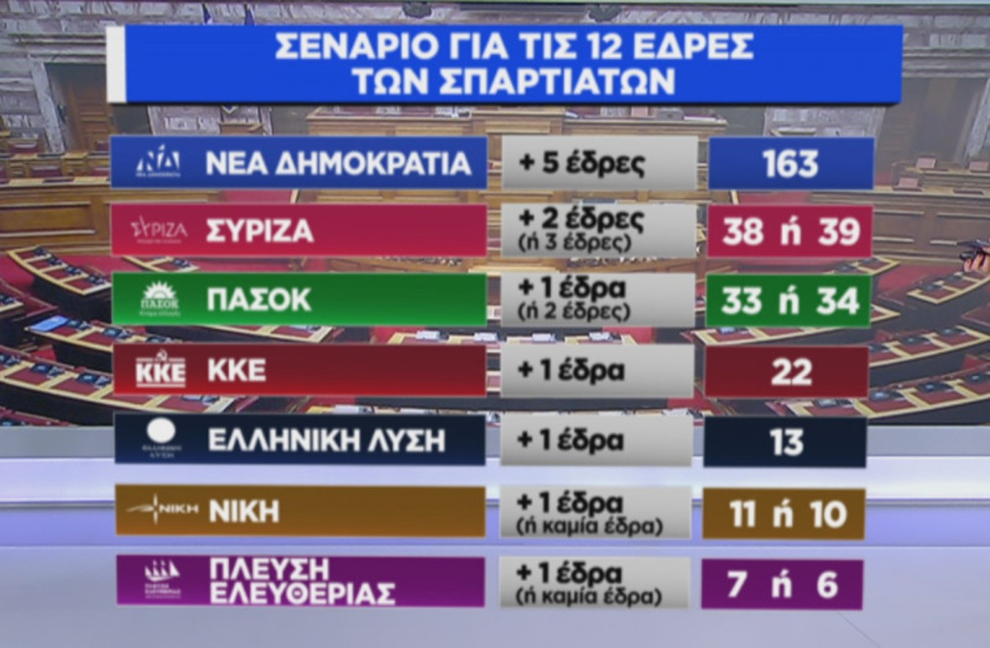 Το ενδεχόμενο να αποβληθεί το κόμμα Σπαρτιάτες από τη Βουλή είναι ένα από τα βασικά σενάρια, γεγονός που θα επιφέρει μία σειρά από ανακατατάξεις στη Σώμα, καθώς οι 12 έδρες θα πρέπει να διανεμηθούν κατ’ αναλογία στα υπόλοιπα κόμματα.