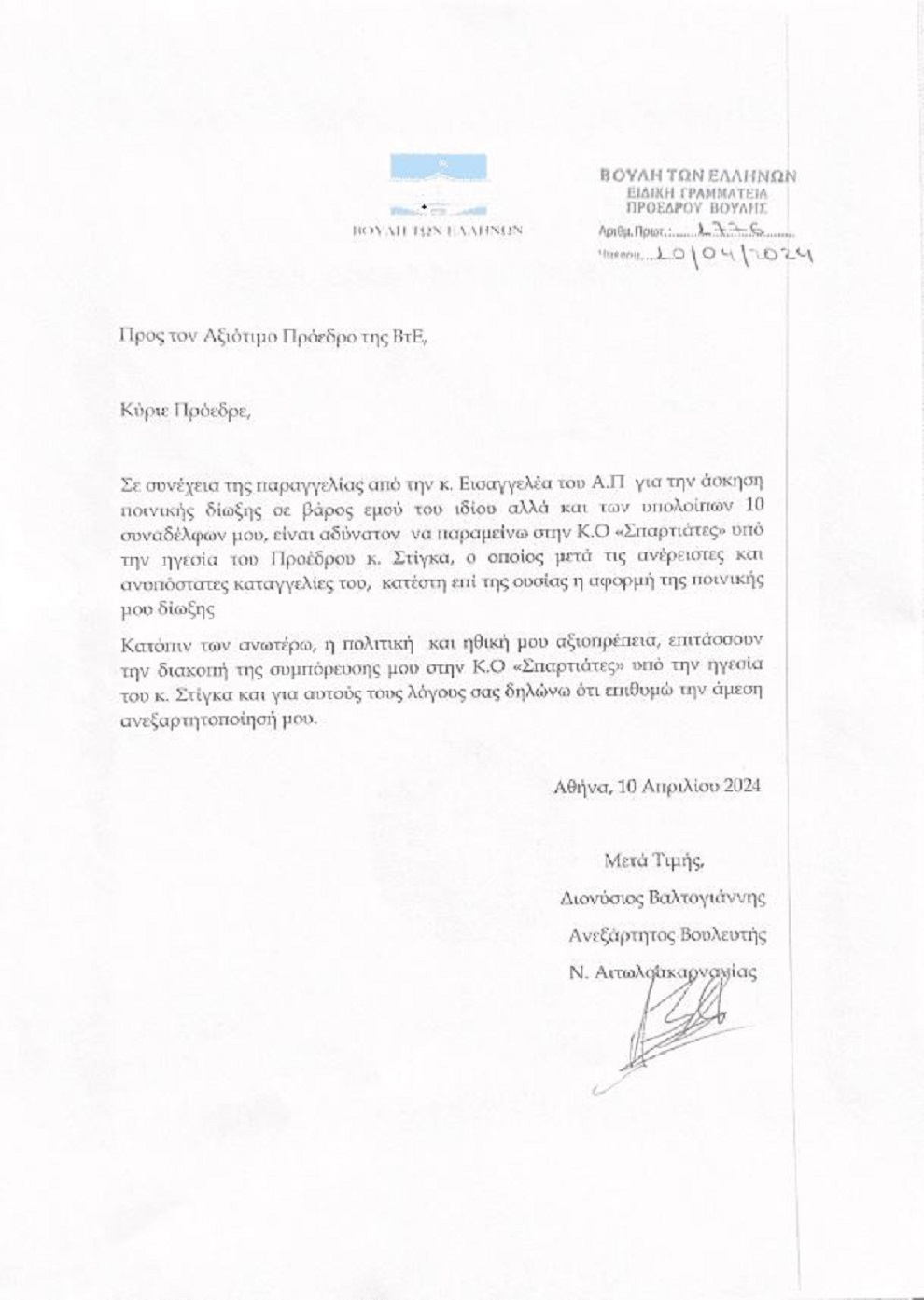 Στην επιστολή του προς τον πρόεδρο του Κοινοβουλίου Κώστα Τασούλα, ο Διονύσης Βαλτογιάννης, αναφέρει τα εξής: