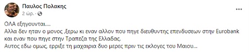 «Όλα εξηγούνται…. Αλλά δεν ήταν ο μόνος, ξέρω κι έναν άλλον που πήγε διευθυντής επενδύσεων στην Εurobank και έναν που πήγε στην Τράπεζα της Ελλάδας. Αυτός εδώ όμως, έριξε τη μαχαιριά δυο μέρες πριν τις εκλογές του Μαΐου», αναφέρειο κ. Πολάκης.