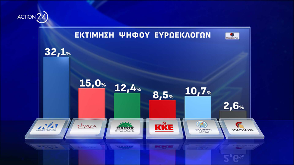 Ειδικότερα, στην εκτίμηση ψήφου για τις ευρωεκλογές, η Νέα Δημοκρατία συγκεντρώνει 32,1% ενώ η αξιωματική αντιπολίτευση το 15% δείχνοντας έτσι ότι παγιώνεται η διαφορά με το τρίτο ΠΑΣΟΚ που λαμβάνει 12,4%.