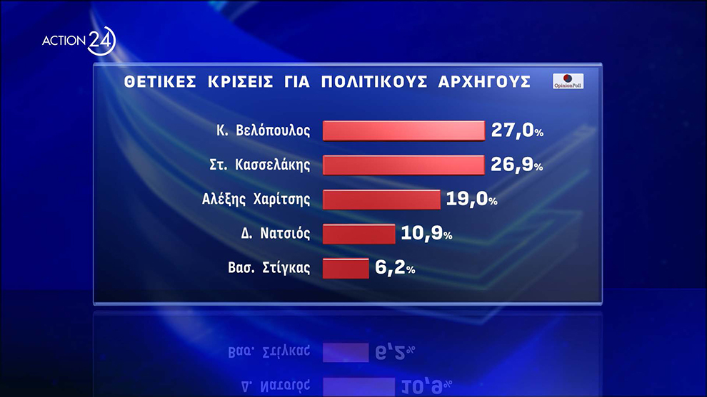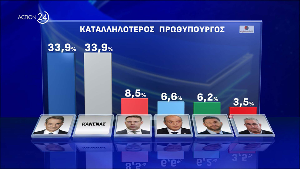 Με διπλάσια διαφορά προηγείται η ΝΔ του ΣΥΡΙΖΑ στην πρόθεση ψήφου σύμφωνα με δημοσκόπηση της Opinion Poll, για λογαριασμό του Action24, ενώ στην καταλληλότητα των πολιτικών αρχηγών για την πρωθυπουργία ο Κυριάκος Μητσοτάκης έρχεται πρώτος αλλά και ισόπαλος με τον… «κανένα».